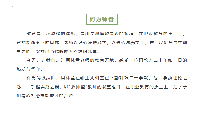 许多学生因他爱上智能制造专业,每当谈及学生,周林孟老师眼中满是欣慰:“看着他们靠技能实现价值,就是我最大的幸福。”