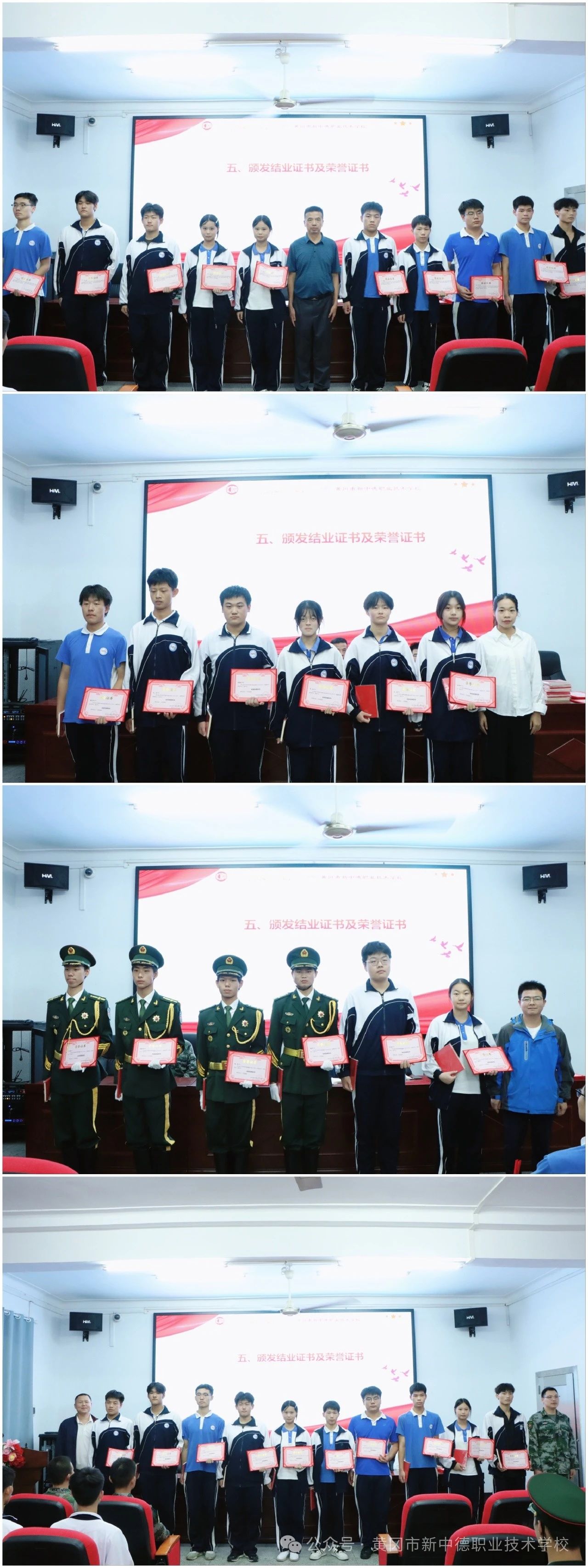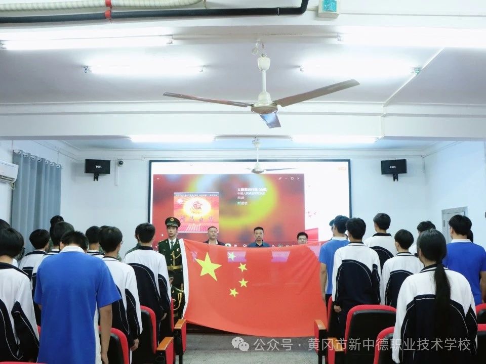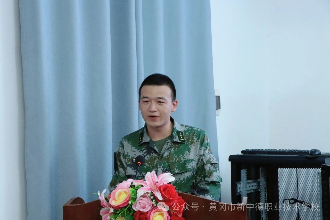 习习秋风泌心脾,飘飘红旗含深情。10月15日晚7点,黄冈市新中德职业技术学校军事小队换届仪式暨表彰大会在教学楼二楼报告厅举行。德育副校长蔡欣、机电部部长张帆、信息部部长郭春峰、商贸部部长倪雅娉、安保科科长王荣俊出席会议,会议由王涵同学主持。