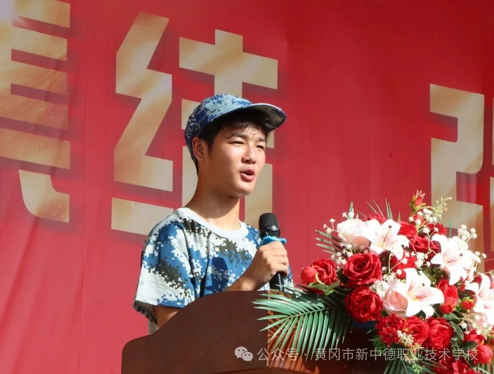 参训新生代表郭锦添同学发言,他庄严承诺:在军训期间一切行动听指挥,严格遵守纪律;吃苦耐劳,刻苦训练;团结协作,互帮互助;巩固成果,传承作风,把在军训中养成的好习惯、好作风延伸到未来的学习生活中去。