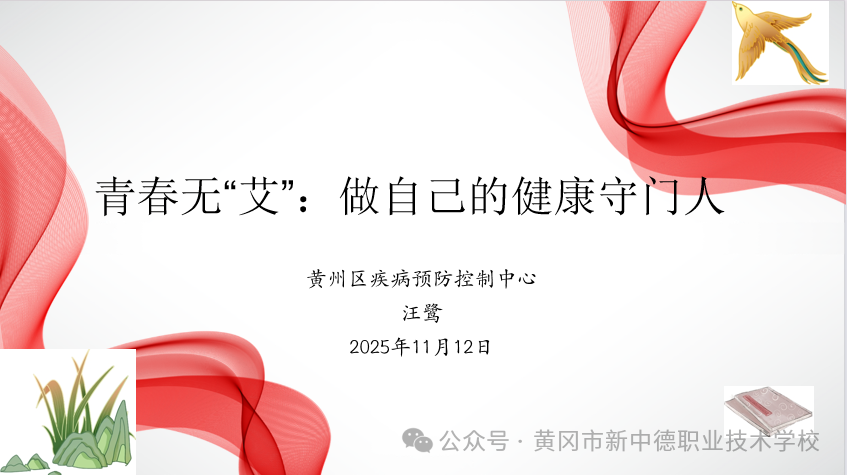 当青春遇上健康,守护便是最美的行囊。11月12日,黄冈市新中德职业技术学校联合黄州区疾病预防控制中心,共同开展“青春无‘艾’:做自己健康守门人”主题公开课。黄州区疾控中心倪丰科长、汪鹭老师亲临现场,用专业、通俗的讲解,为全校学子带来了一堂干货满满的防艾知识盛宴,让科学防护理念扎根青春心田。